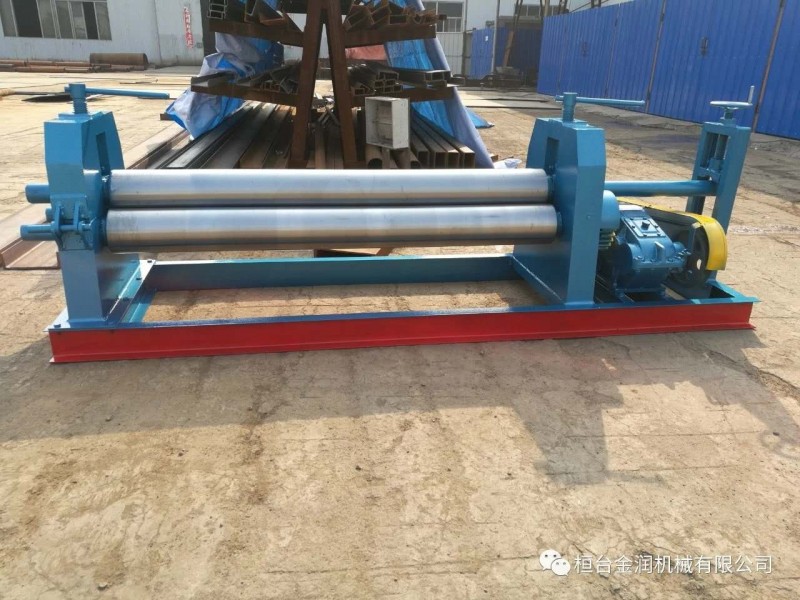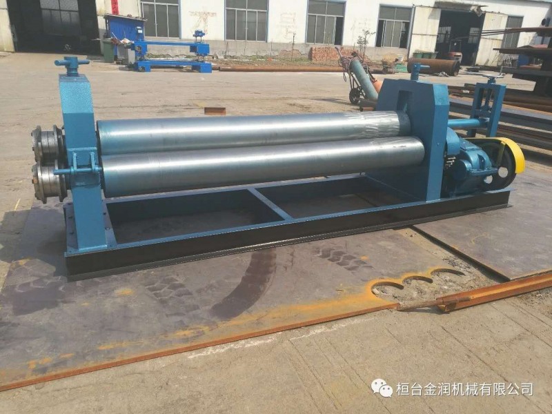 半自動(dòng)卷板機(jī),該機(jī)結(jié)構(gòu)式為三輥對稱式,上輥在兩下輥中間對稱位置作垂直升降運(yùn)動(dòng),通過人工擰動(dòng)絲桿使上輥垂直升降,兩下輥?zhàn)餍D(zhuǎn)運(yùn)動(dòng),通過減速機(jī)的輸出齒輪與下輥齒輪嚙合,為卷制板材提供扭矩。上輥可分離取料手動(dòng)升降起輥。
